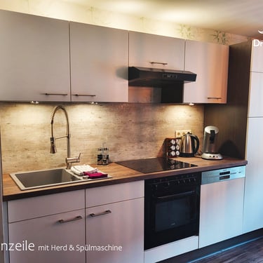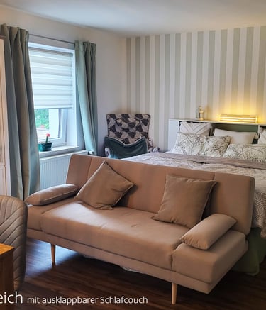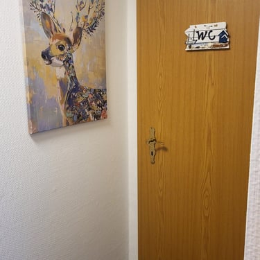Die Ferienwohnung liegt in einem Anbau und wurde von uns in der ersten Jahreshälfte 2024 liebevoll von Grund auf renoviert. Sie verfügt über einen großen Aufenthaltsraum, der aufgeteilt ist in einen Küchen/Essbereich und einen Schlafbereich. Zudem gibt es ein Bad, in dem eine sehr geräumige Duschkabine mit Regendusche zu finden ist. Das WC mit Waschtisch und Spiegel ist in einem zweiten Raum separiert, sodass sich auch mehrere Personen bei der Morgenhygiene nicht auf die Füße treten. Im kleinen Eingangsflur ist genügend Platz, um Jacken und Schuhe aufzuhängen.